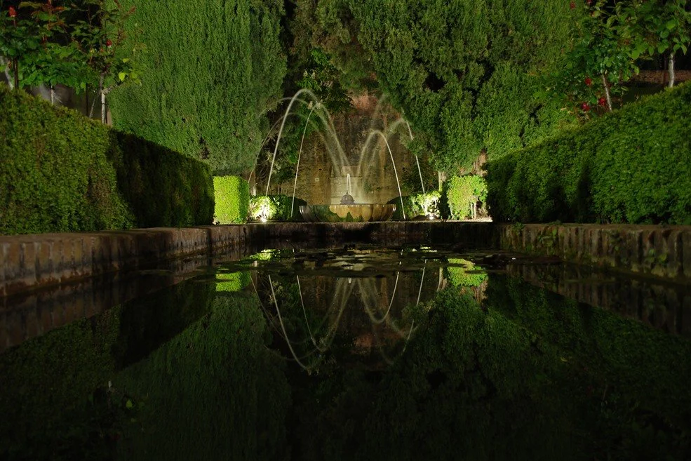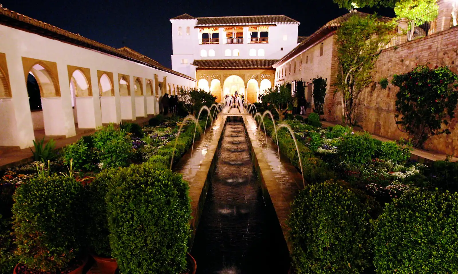 Bajo un cielo estrellado, los jardines y patios se iluminan sutilmente, creando un ambiente de misterio y romance. El verdadero protagonista es el sonido: el murmullo constante del agua en la Escalera del Agua y el Patio de la Acequia se intensifica en el silencio de la noche. Es un paseo mágico donde el aroma de los jazmines y el frescor te transportan a la esencia de Al-Ándalus.