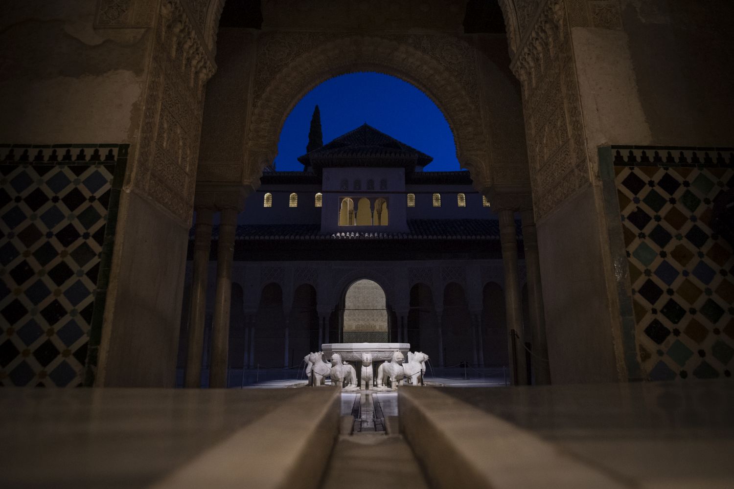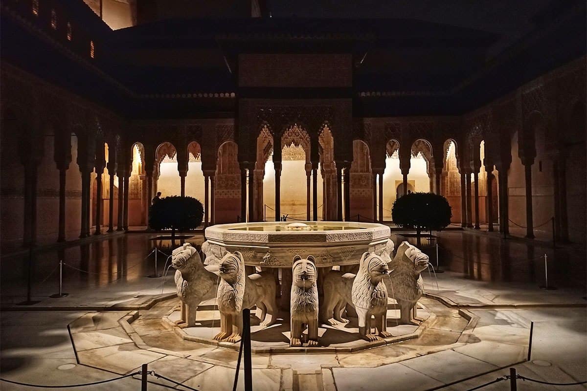 Las luces tenues realzan la delicadeza extrema de las yeserías y los mocárabes, creando un juego de sombras que parece dar vida a las paredes. Pasear por el Patio de los Leones o Arrayanes en esta quietud íntima es sentir el pulso de la historia. Una experiencia inolvidable que revela el alma secreta de la fortaleza roja.
